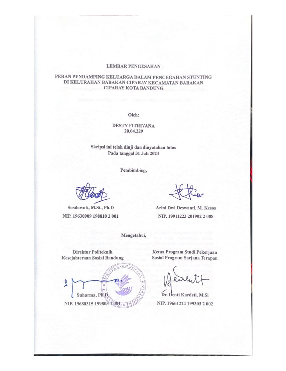 DESTY FITRIYANA 20.04.229, Peran Pendamping Keluarga dalam Pencegahan Stunting di Kelurahan Babakan Ciparay Kecamatan Babakan Ciparay Kota Bandung, Politeknik Kesejahteraan Sosial Bandung, Tahun 2024, Dosen Pembimbing: Susilawati dan Arini Dwi Deswanti