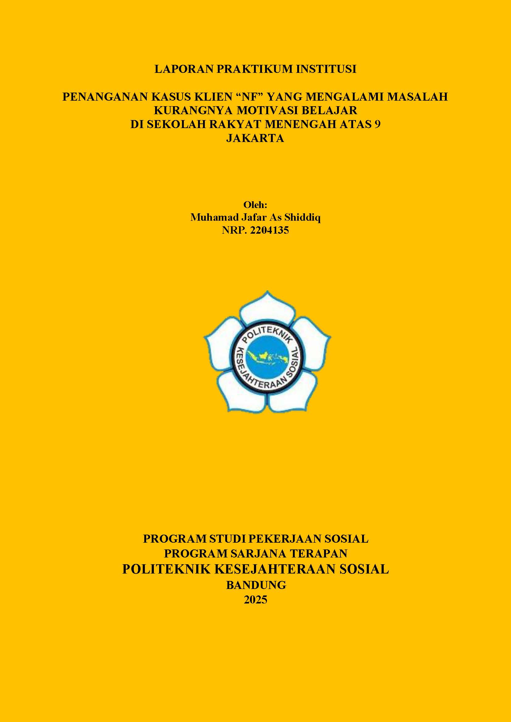 LAPORAN PRAKTIKUM INSTITUSI PENANGANAN KASUS KLIEN “NF” YANG MENGALAMI MASALAH KURANGNYA MOTIVASI BELAJAR DI SEKOLAH RAKYAT MENENGAH ATAS 9 JAKARTA