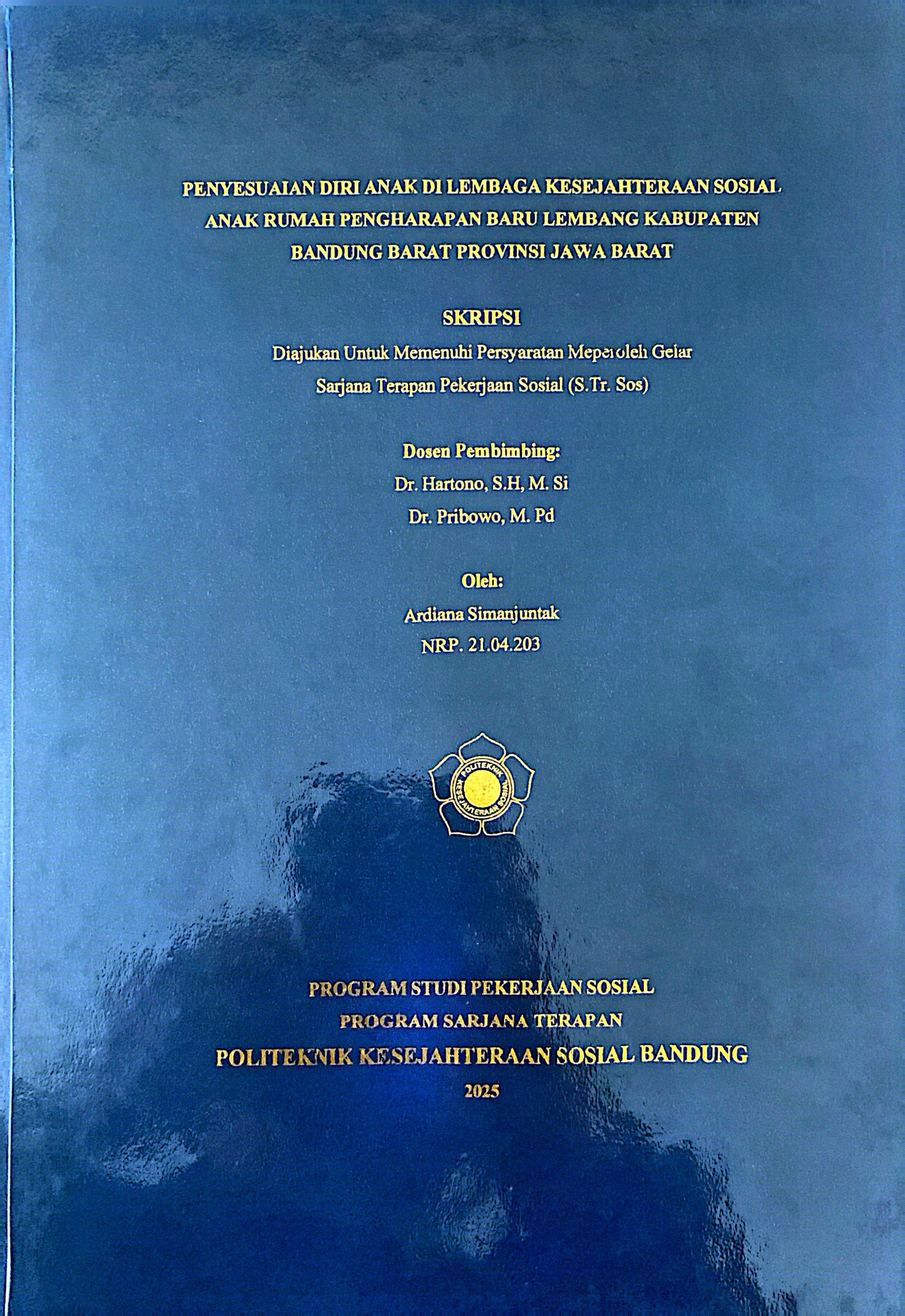 ARDIANA SIMANJUNTAK, NRP. 21.04.203. Penyesuaian Diri Anak di Lembaga Kesejahteraan Sosial Anak Rumah Pengharapan Baru Lembang. Dibimbing oleh Hartono dan Pribowo.